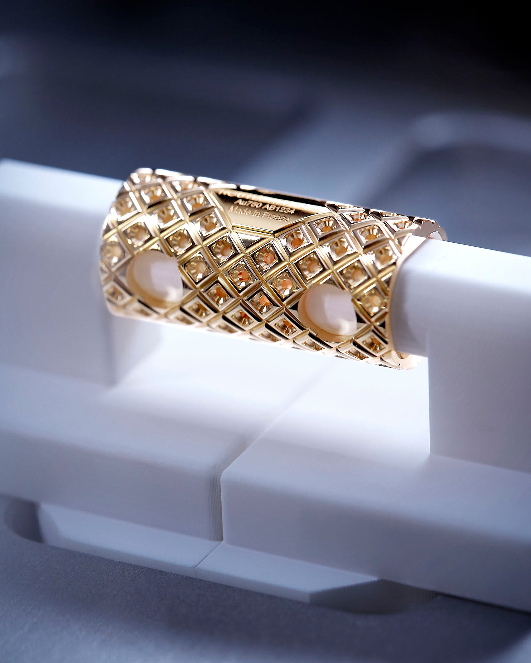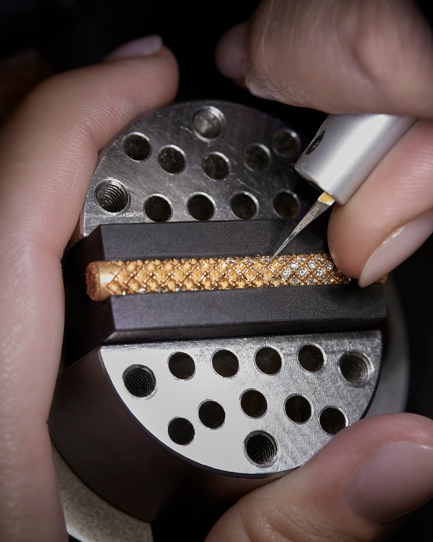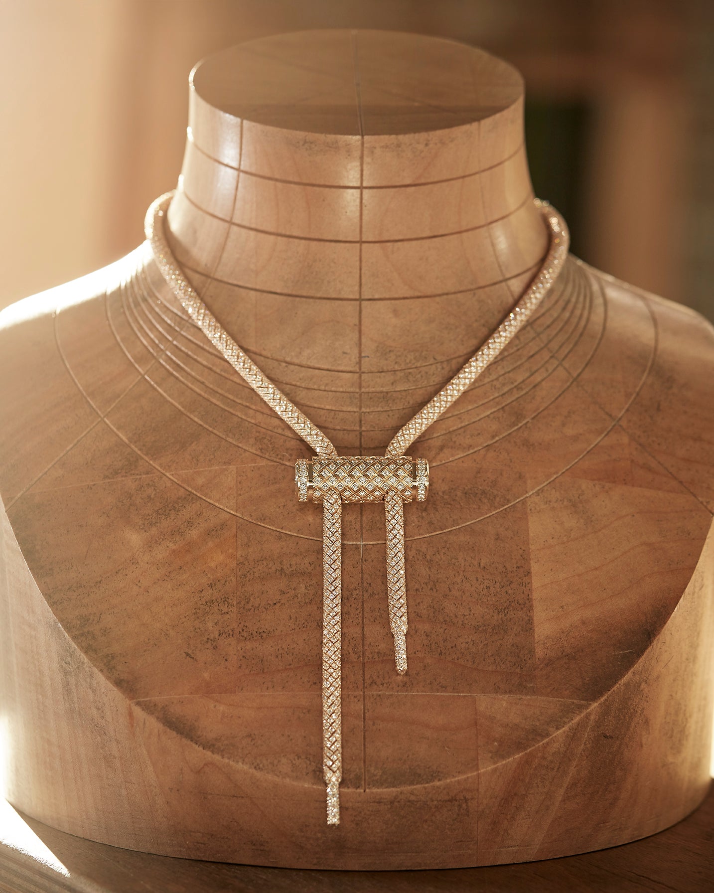 Crafted in 18-karat yellow gold and set with 2,752 diamonds—for a total of 29.43 carats of GVS-quality stones—this piece redefines fluidity, flexibility, and light.
